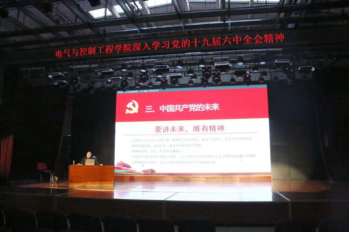 11月25日下午,電氣與控制工程學院黨委在學生綜合服務樓多功能廳召開了學院黨員大會,專題學習黨的十九屆六中全會精神。大會特邀我校黨的十九屆六中全會精神師生宣講團成員、馬克思主義學院周守高老師作宣講報告,學院黨委委員、全體師生黨員共計300余人參加了大會,學院黨委書記李穎宏主持報告會。周守高老師從時空兩個維度、四個方面結合中國共產黨黨史深入解讀了黨的十九屆六中全會做出的大會決議報告。首先以“三個歷史決議”為引,...