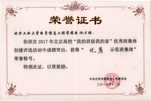 近日,2017年北京高校“我的班級我的家”優秀班集體創建評選活動在北京工業大學舉行,我校電信學院電14-5班在全市百余個參賽班集體中脫穎而出,榮獲2017年北京高校“優秀示范班集體”榮譽稱號。十年寒窗苦爭渡,群英薈萃晉元路跨別高中,揮別父母,35名同學集合在北京美麗的西山腳下,這里鐘靈毓秀,風光怡然。日月交替,夏秋輪回,這里是夢開始的地方。北方工業大學電子信息工程學院電14-5班組建于2014年9月,共有35人,其中黨...