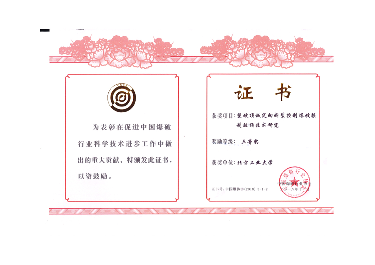 近日,中國爆破行業協會公布了2018年度中國爆破行業科學技術獎授獎項目,我校教師參與的項目獲得一等獎1項、三等獎1項。由我校土木工程學院張召冉博士參與完成的“淮南礦區巖巷快速掘進集成技術研究”獲得科學技術一等獎,該項目在爆破及破巖技術、裝備配套、工藝優化以及組織管理等方面實現了多項技術創新,顯著提高了淮南礦區巖巷掘進效率,降低了生產成本,取得了顯著的經濟和社會效益。參與完成的“堅硬頂板定向斷裂控制爆破...
