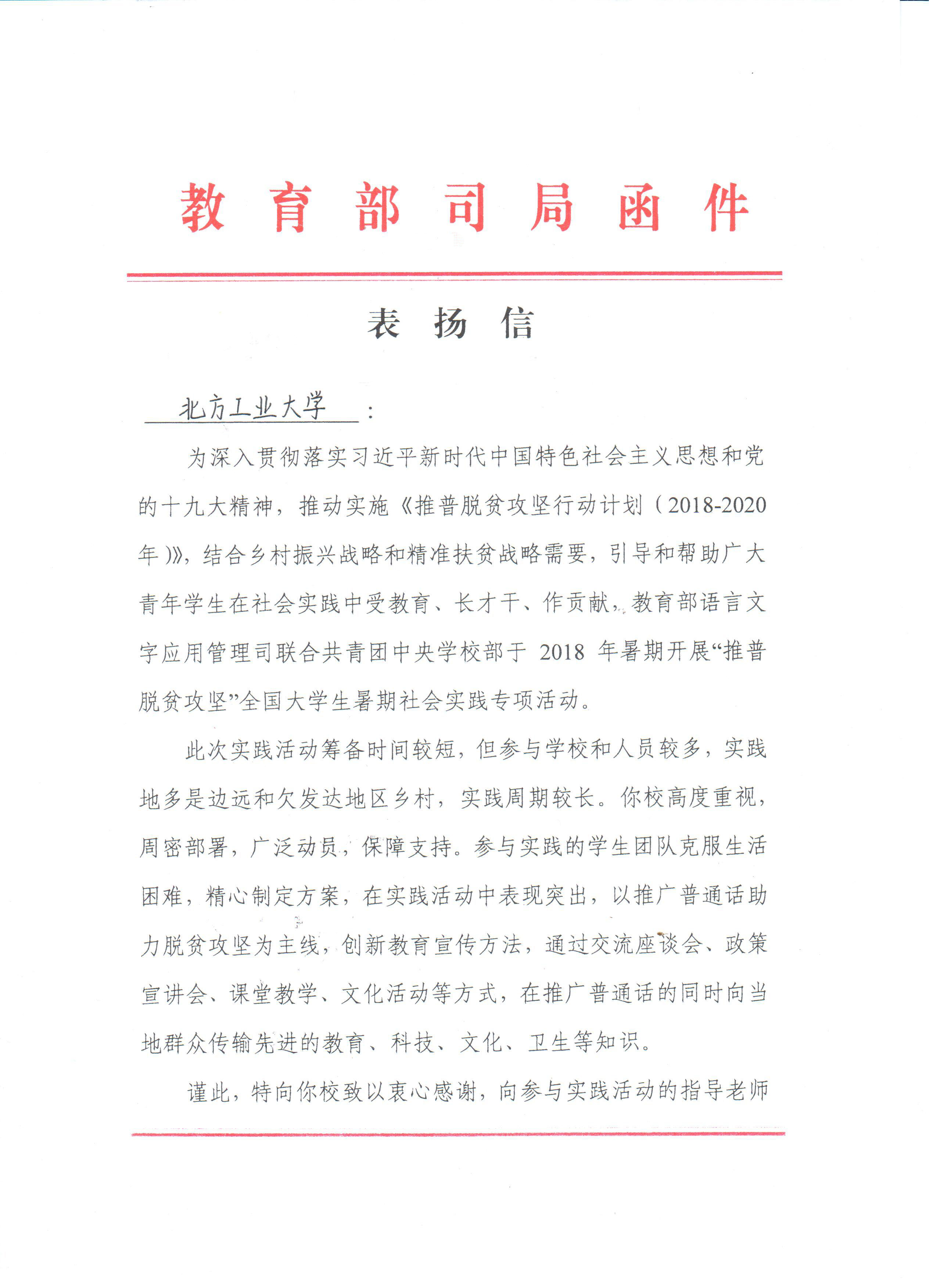 近日,學校收到教育部語言文字應用管理司和團中央學校部發來的表揚信,對我校參加2018年“推普脫貧攻堅”全國大學生暑期社會實踐的優秀團隊提出表揚。今年暑期,由我校文法學院牽頭,文法學院和經濟管理學院7名學生組成的“心系故里”實踐團前往新疆和田地區開展了“推普脫貧攻堅”專項社會實踐,并被評為2018年全國大中專學生志愿者暑期“三下鄉”社會實踐活動優秀團隊。??編輯:單連良?責任編輯:左芳