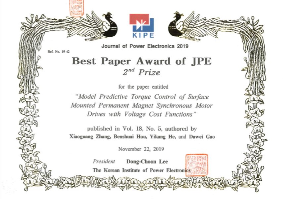 近日,從韓國電力電子學會KIPE (The Korean Institute of Power Electronics)獲悉,我校電氣與控制工程學院教師張曉光于2018年在國際學術期刊Journal of Power Electronics發表的論文“Model Predictive Torque Control of Surface Mounted Permanent Magnet Synchronous Motor Drives with Voltage Cost Functions”(第18卷5期)被評為該期刊2019年度最佳論文。Journal of Power Electronics期刊由韓國電力電子學會主辦,是SCI...