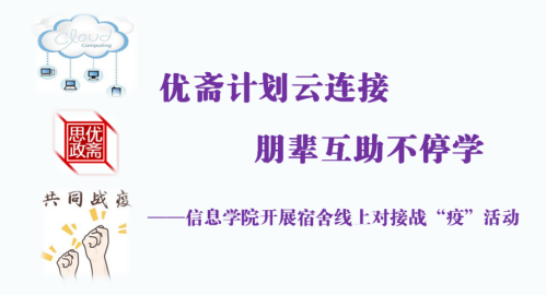 為豐富疫情防控期間同學們的居家學習生活,信息學院結合當下實際,由優齋工作室牽頭組織高年級勵志學長與2019級全體新生開展“優齋計劃云連接,朋輩互助不停學”宿舍線上對接活動。活動形式多樣、內容豐富、覆蓋面廣,學生反響積極。優齋賽學,開展方言說戰“疫”視頻大賽。宿舍成員與勵志學長用各自方言表達對全民戰疫或居家線上學習的感想,結合自身專業特點,通過主題策劃、文案創作、視頻制作等環節鍛煉學生的實踐動手能力...