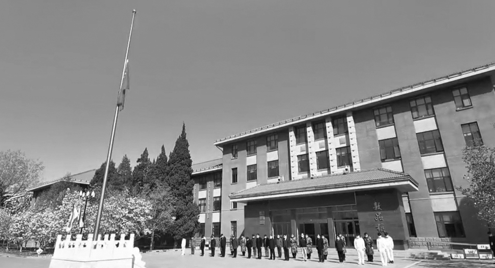 4月4日?上午10時,防空警報拉響,舉國哀悼、山河同悲。校黨委書記鄭文堂、副校長胡應平、校黨委副書記田紅芳與在校的教職工代表、學生代表、疫情防控工作人員代表等,在敦品樓前列隊集體默哀,深切悼念在抗擊新冠肺炎疫情斗爭中犧牲的烈士和逝世的同胞。