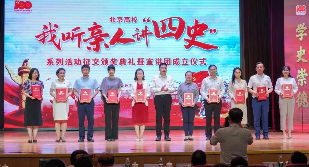 6月10日,北京高校“我聽親人講‘四史’”系列活動征文頒獎典禮及宣講團成立儀式在北京第二外國語學院舉行。我校機械與材料工程學院羅弘瑞同學斬獲一等獎并成為宣講團成員,機械與材料工程學院李生生同學榮獲二等獎,文法學院馬楠同學、經濟管理學院宋伯犀同學榮獲優秀獎,我校被授予“最佳組織獎”。“我聽親人講四史”征文活動由北京市委教育工委于1月至5月組織開展,是北京教育系統慶祝中國共產黨建黨100周年“永遠跟黨走”...