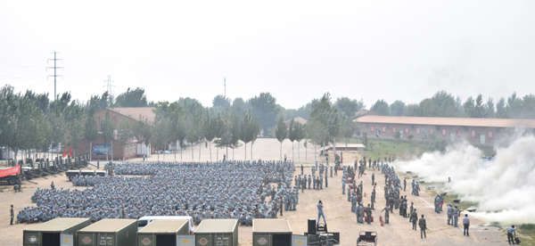 7月10日下午,2014級軍訓學生滅火逃生演練活動在軍訓基地舉行。