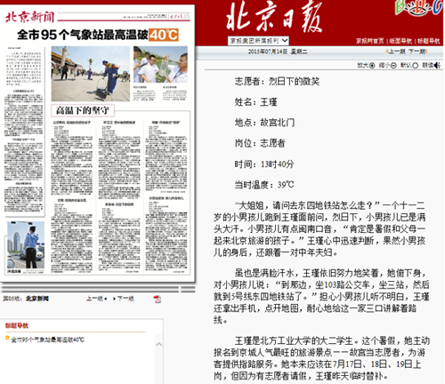 7月14日的《北京日報》第5版對我校計算機學院、電子信息工程學院聯合開展的故宮志愿服務活動進行了報道,文章對參與服務的志愿者進行了專題采訪。