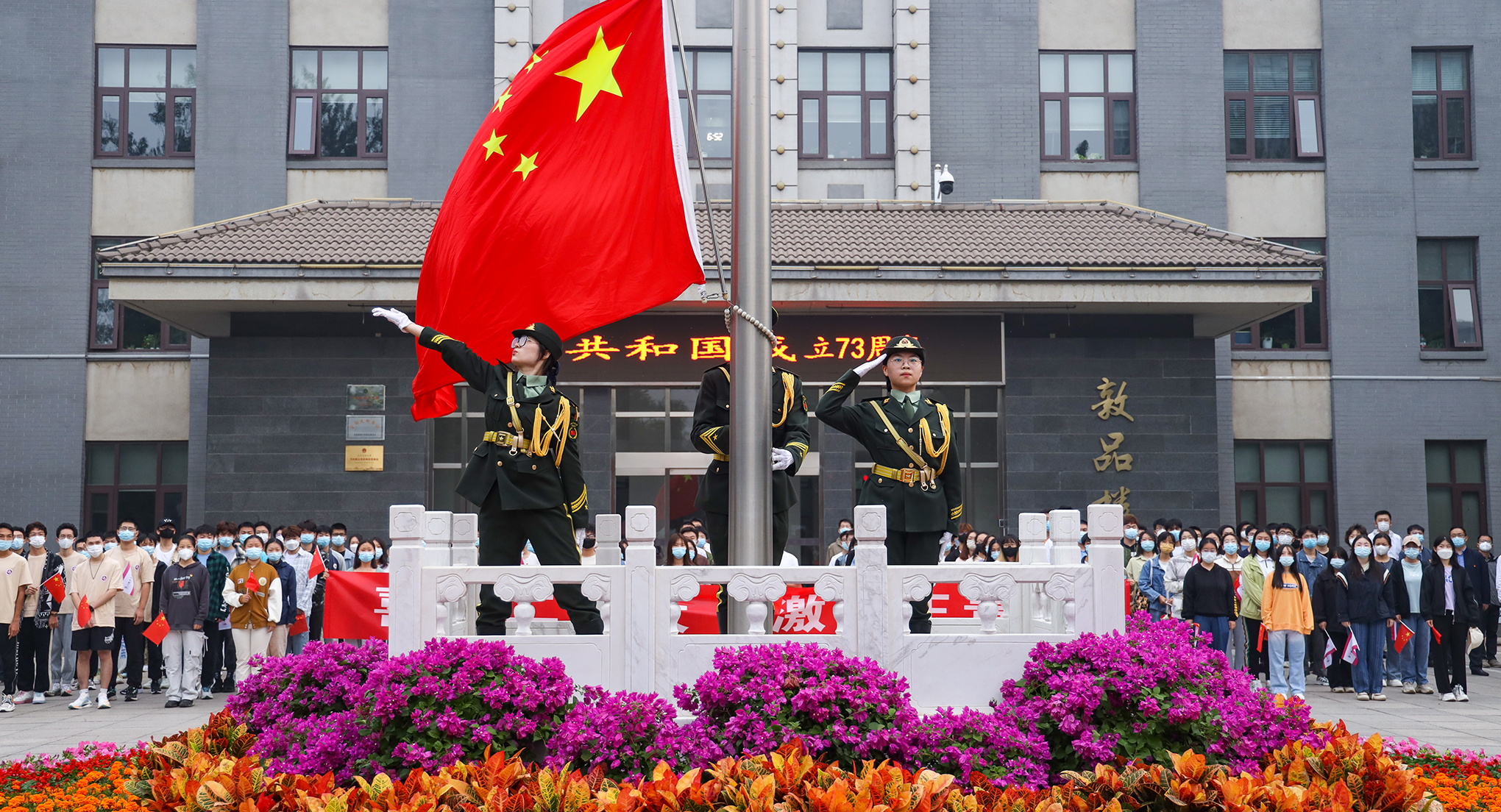 為慶祝中華人民共和國(guó)73周年華誕,激勵(lì)工大學(xué)子愛國(guó)奮進(jìn),勇?lián)聲r(shí)代的青年責(zé)任,喜迎黨的二十大召開,10月1日,學(xué)校在敦品樓廣場(chǎng)隆重舉行“喜迎二十大,激揚(yáng)正青春”國(guó)慶主題升旗儀式。學(xué)校黨委書記繆勁翔,黨委常委、副校長(zhǎng)栗蘋,黨委常委、副校長(zhǎng)王力及學(xué)工部、校團(tuán)委和各學(xué)院師生代表200余人參加儀式。校團(tuán)委書記楊超主持升旗儀式。早上7點(diǎn)整,迎著初升的朝陽(yáng),第五屆國(guó)旗班隊(duì)員邁著鏗鏘有力的步伐,護(hù)衛(wèi)著鮮艷的五星紅旗行...