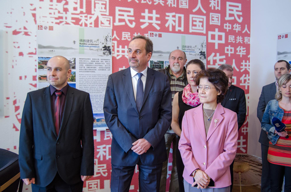 (中國駐捷克大使馬克卿女士(中)在Marek Vochozka校長(左一)、Jan Kohout校長(左二)陪同下出席展覽開幕式) 4月5日至20日,由中捷合作交流中心主辦、北方工業(yè)大學(xué)協(xié)辦的中國文化展在我校友好學(xué)校、捷克布杰約...