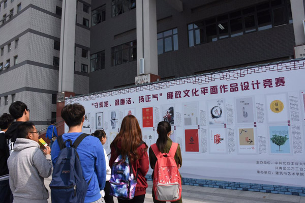 9月29日,由中共北方工業(yè)大學(xué)紀(jì)律檢查委員會、共青團(tuán)北方工業(yè)大學(xué)委員會主辦,建筑與藝術(shù)學(xué)院承辦的“守規(guī)矩、倡廉潔、揚(yáng)正氣”——廉政文化平面作品設(shè)計(jì)競賽展在毓秀廣場舉行。