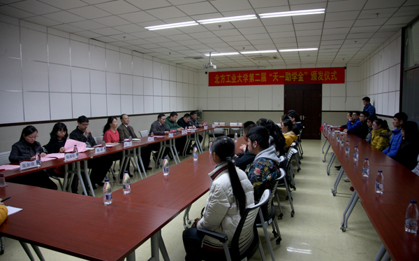 11月25日,北方工業大學第二屆“天一助學金”頒發儀式在學生服務樓318會議室舉行。