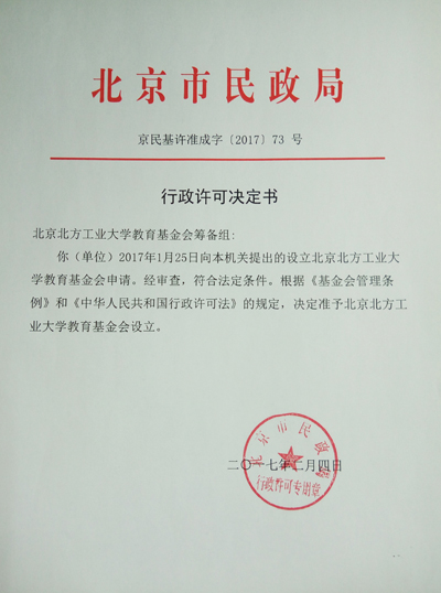 近日,經北京市民政局審核,準予北京北方工業大學教育基金會成立。