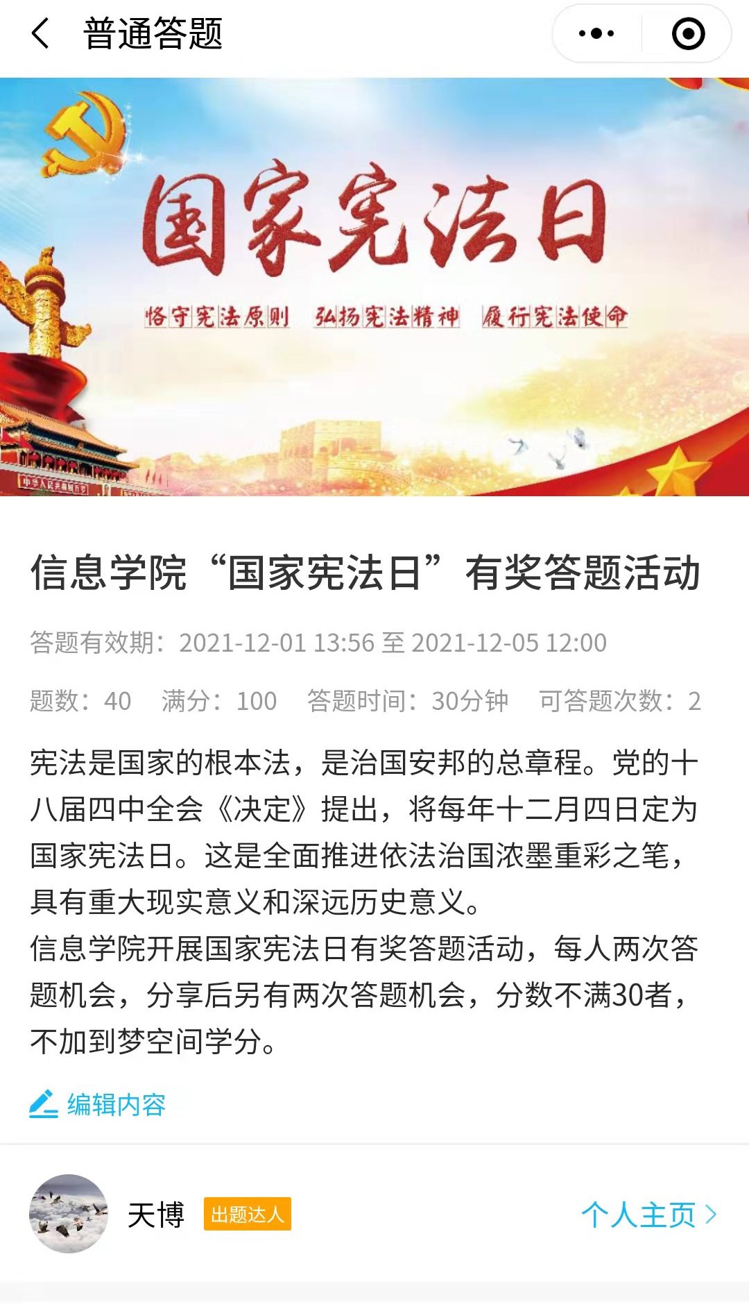 為深入學(xué)習(xí)貫徹習(xí)近平總書記憲法重要論述精神,全面加強(qiáng)憲法實(shí)施和監(jiān)督,普及憲法知識(shí),弘揚(yáng)憲法精神,增強(qiáng)法治意識(shí),提高學(xué)生法律素養(yǎng),營造校園法治文化氛圍,強(qiáng)化學(xué)生自我保護(hù)意識(shí),培養(yǎng)學(xué)生養(yǎng)成學(xué)法、懂法、守法、用法的好習(xí)慣,有效地樹立和維護(hù)學(xué)校良好的學(xué)風(fēng)校風(fēng)。信息學(xué)院于11月29日至12月16日開展“弘揚(yáng)憲法精神,構(gòu)建和諧校園”憲法知識(shí)競賽。為嚴(yán)格落實(shí)疫情防控要求,本次憲法知識(shí)競賽采用線上云競答的方式進(jìn)行,120...