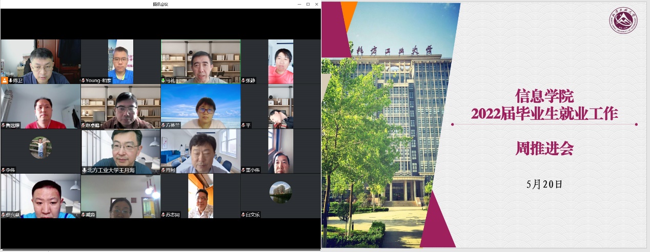 為認真貫徹落實學校2022屆畢業生就業工作推進會會議精神,持續推進就業工作,信息學院開展“‘就’不停歇,周周推進”計劃,建立2022屆畢業生就業工作周推進會機制,每周五學院院長、書記召集系主任、畢業班輔導員、班導師(導師)召開推進會持續研討推進就業工作,將學校就業工作“50日沖刺”活動落小落實落細。5月20日下午,信息學院通過騰訊會議在線召開2022屆畢業生就業工作推進會,學院院長馬禮、黨委書記王月海、各系主任...