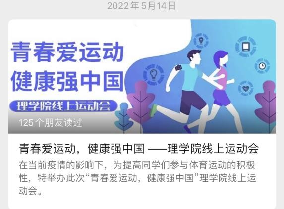 近日,共青團中央聯合國家體育總局、全國學聯下發通知,對面向大學生組織開展“青春愛運動,健康強中國”全民健身活動進行部署安排。理學院積極響應校團委號召,開展三個階段的打卡挑戰賽。第一期已經落下帷幕:經過六天的“平板支撐線上挑戰賽”,比較單場累計支撐時長的方式開展平板支撐活動,激發了學生體育鍛煉熱情,倡導了健康科學的鍛煉習慣。在第一階段的活動中,理學院號召參賽同學于5月14日-5月18日內進行“平板支撐”...