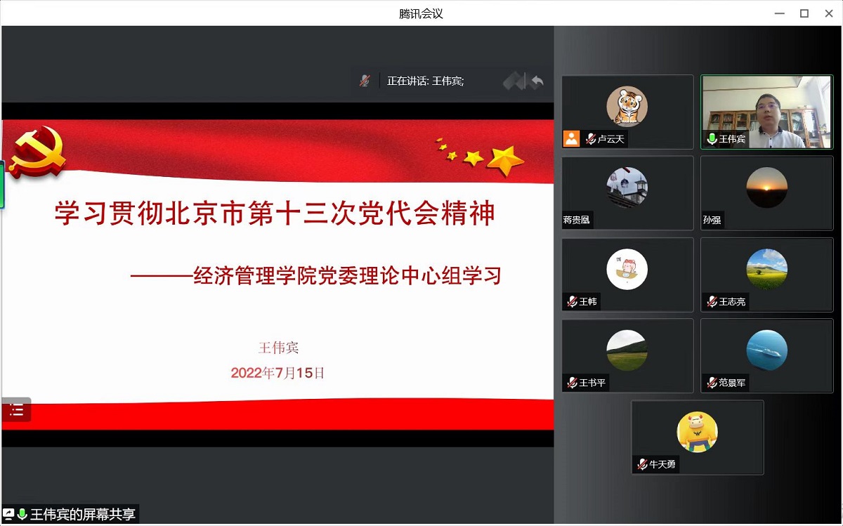 7月15日下午,經濟管理學院黨委理論學習中心組召開線上學習會,集中學習北京市第十三次黨代會精神。會議由學院黨委書記王偉賓主講,全體黨委委員參加。王偉賓領學了北京市第十三次黨代會報告。他指出,大會報告全面回顧和深刻概括了過去五年北京各項事業取得的輝煌成就和實踐體會,明確提出了今后五年發展的指導思想、奮斗目標和重要舉措,充分體現了北京“首善”標準,為未來北京經濟社會全面發展奠定了堅實基礎和政治保障。習...