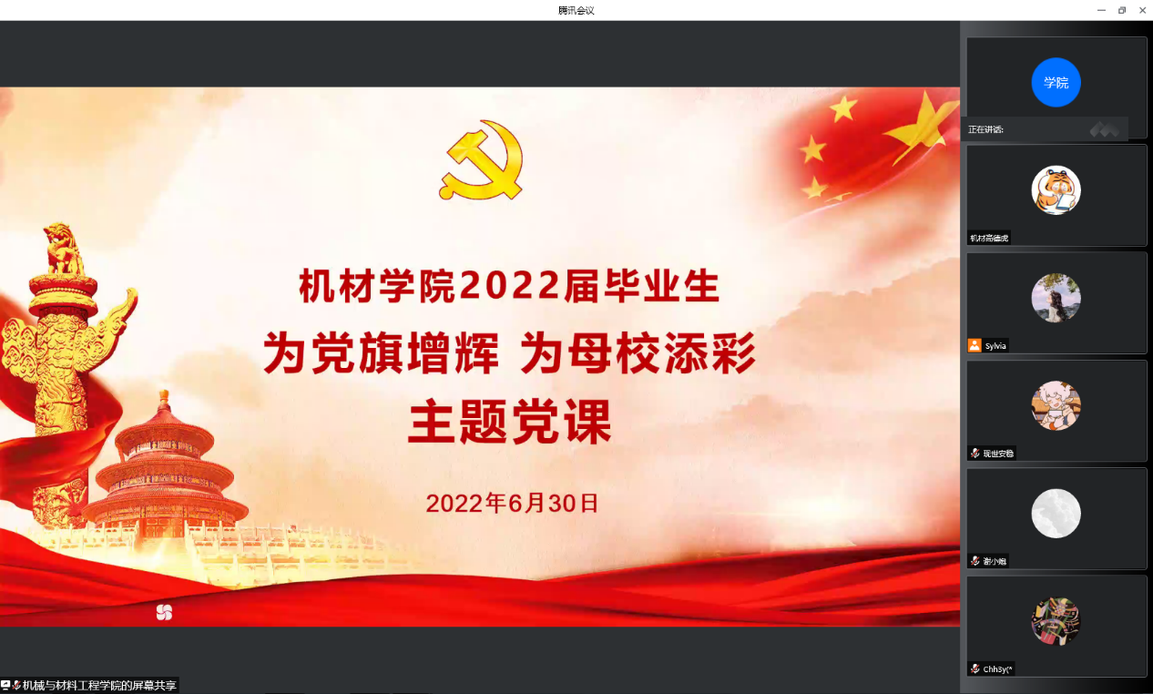 為慶祝中國共產黨成立101周年,加強對畢業生黨員的思想政治教育,激發青年黨員的愛國愛黨愛校情懷,機材學院召開“為黨旗增輝 為母校添彩”主題黨課,院班子集體為2022屆畢業生講黨課。全體畢業生黨員參加了黨課學習。學院黨委副書記石卉結合習近平總書記在建團百年慶祝大會上的講話精神,鼓勵畢業生做時代發展的建設者、做科技創新的開拓者、做工大精神的弘揚者、做黨的事業的傳承者,為實現中華民族偉大復興,貢獻工大學子的...