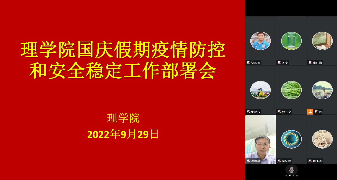 為落實學校關于國慶假期安全穩定工作的會議精神,9月29日晚,理學院線上召開國慶假期安全穩定和疫情防控工作部署會。學院黨委委員、班子成員、系主任、責任教授、支部書記、班導師、輔導員、辦公室全體老師參加會議。會議由學院黨委書記龔維華主持。會上,龔維華傳達了上級和學校關于國慶假期疫情防控和安全穩定工作的最新精神,并就學院國慶期間重點工作做了具體部署。一是嚴格落實北京市和學校疫情防控政策,進一步落實常態化...