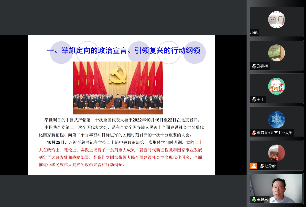 11月18日下午,離退休黨委理論學習中心組召開線上學習會,專題學習黨的二十大精神。離退休黨委委員王包泉作專題宣講,黨委委員、黨支部書記、副書記、支部委員、全體工作人員等近30人參加了學習,學習會由離退休黨委書記趙永兵主持。王包泉以“認真學習黨的二十大精神,以中國式現代化全面推進中華民族偉大復興”為主題,從“舉旗定向的政治宣言、引領復興的行動綱領,領航新時代新征程的堅強領導集體,以中國式現代化全面推進...