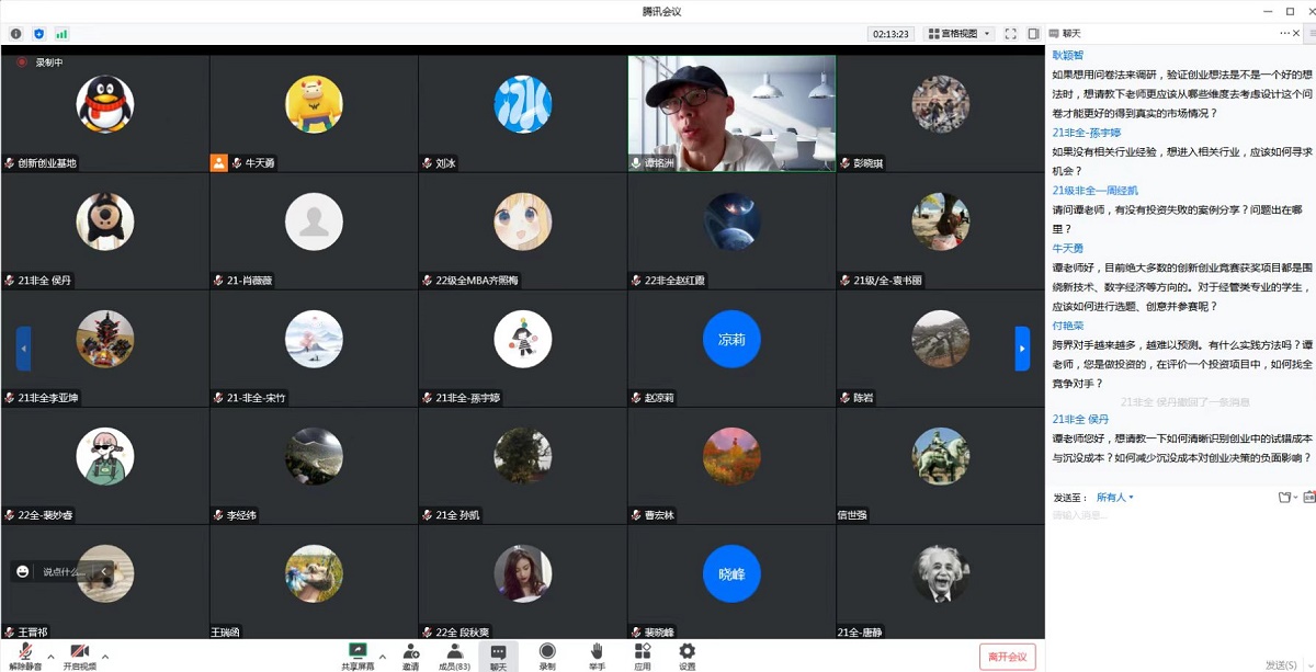 11月15日下午,經濟管理學院通過騰訊會議在線舉辦了第一期“創新創業導航”系列講座。中國社科院一帶一路國際智庫、藍迪國際智庫執行主任胡宇東老師受邀以“創業者的九段修煉”為題與我校近百名師生開展了在線報告與交流。講座由經濟管理學院創新創業基地劉冰副教授主持。胡宇東老師具有豐富的創業及投資經歷。他分享了自己的成長、參賽和創業經歷,認為創業者走向成熟需經過九重修煉:發現熱愛、掌控身體、善用大腦、時間管理...