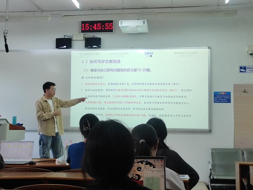 5月8日下午,經濟管理學院勵學論壇第七期在勵學樓310教室舉行,北方工業大學經濟管理學院經濟研22級在讀優秀研究生賴凱豐進行了主題為“研究生論文寫作分享”的講座。本次講座賴凱豐同學結合自身在學術道路上摸索的經驗對研究生論文寫作的思路和方法作了詳盡的介紹。首先他點出論文初學者的難點和誤區,主要是缺乏理論認識和知識創新理解導致內容邏輯不足。其次,講解了實證論文的基本邏輯。然后著重講解了論文中的文獻綜述部分...