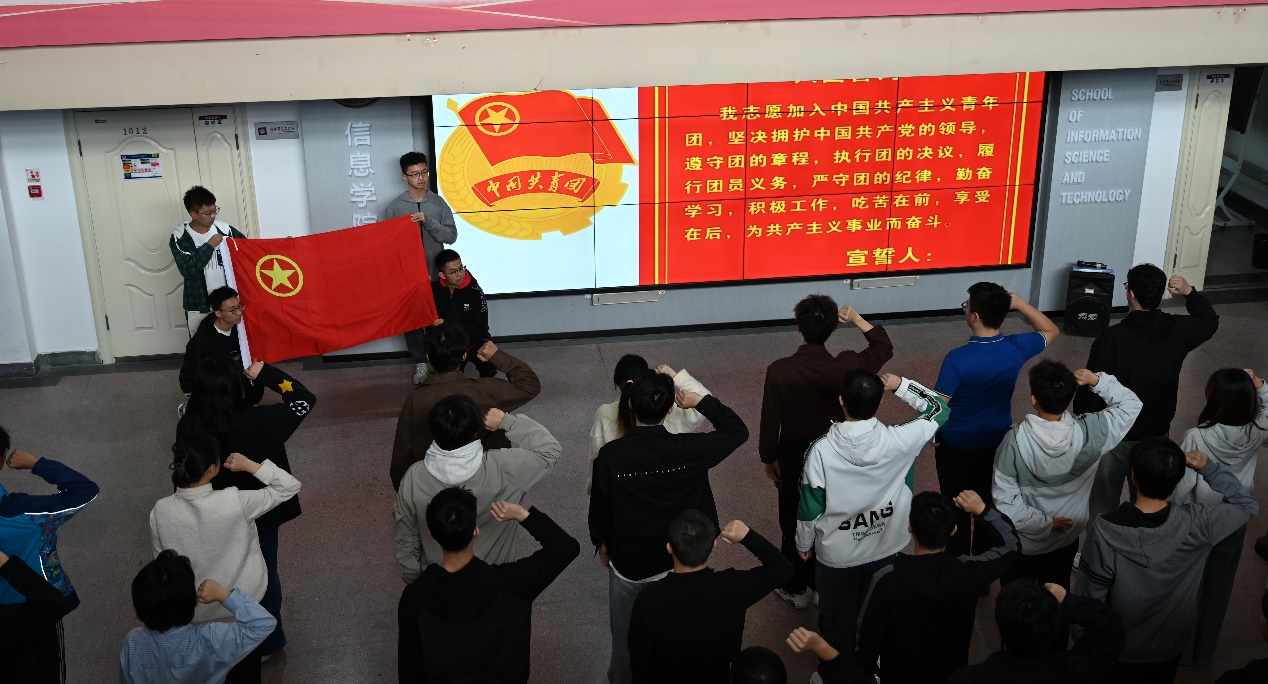 金秋十月,桂子飄香。10月12日中午,信息學院在瀚學樓十層大廳舉行2024年新團員入團宣誓儀式。信息學院黨委副書記陳衛、學院團委書記楊和家、150余名新老團員代表參加活動。儀式現場,氣氛莊重而熱烈,新團員們懷揣著對團組織的向往和為共產主義事業奮斗的堅定信念,齊聚一堂。他們將在這個美好的秋天,用錚錚誓言奏響青春的樂章。學院黨委副書記陳衛老師為新團員代表佩戴團徽,頒發團員證。祝賀新團員加入共青團大家庭,開啟人...