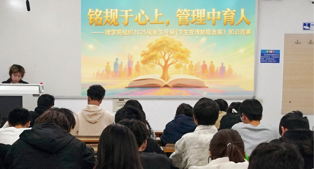 為引導2025級新生筑牢規則意識,賦能自我管理,快速完成角色轉變,11月5日,理學院在勵學樓組織了面向全體新生的《學生管理制度選編》知識競賽。本次活動是學院“管理育人”工作的重要環節,旨在通過制度學習,幫助新生將外在規范內化為內在自覺,為實現高效的自我管理、自我服務、自我教育、自我監督奠定堅實基礎。競賽采用閉卷形式,內容全面覆蓋學籍、獎懲、宿舍管理、學術規范及安全紀律等章節。學院精心命題,特別強化了與...