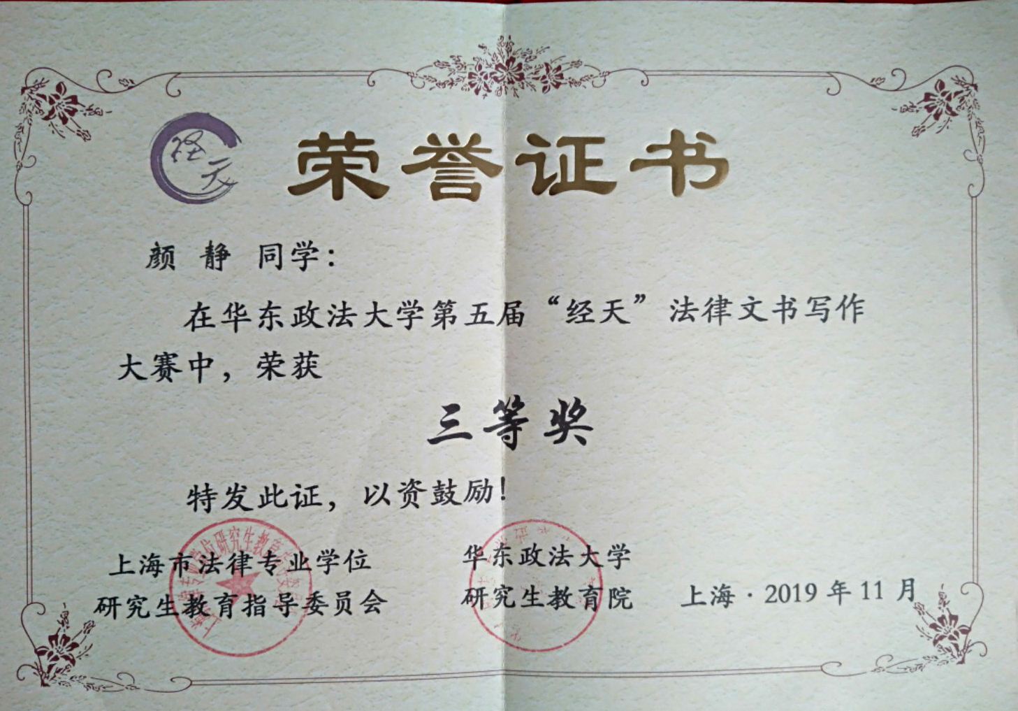 我校2019級法律碩士研究生顏靜在第五屆“經天杯”法律文書競賽中,充分展現法學學子的精神風貌和專業素養,過關斬將,從599位選手中脫穎而出,躋身前六強,榮獲三等獎?!敖浱毂狈晌臅傎愂巧虾J蟹蓪I學位研究生教育指導委員會和華東政法大學研究生教育院主辦,華東政法大學法律碩士教育中心承辦的全國性比賽。本次大賽有來自北京大學、同濟大學、復旦大學、華東政法大學等57所高校數百名選手參賽。該項成績的取得得益...