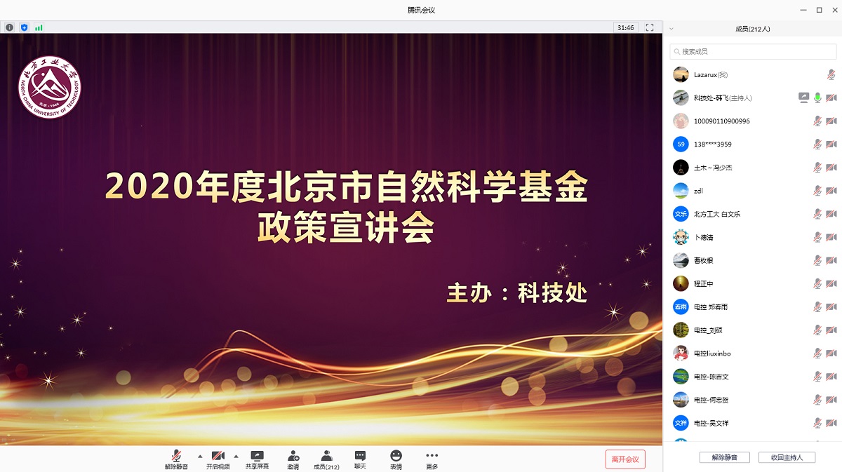 6月24日上午,為進一步提升基金項目申報率和資助率,科技處組織召開了2020年北京市自然科學基金項目宣講會。因疫情原因,本次宣講會采用了線上會議的模式,共計210余位教師參加了本次宣講會,會議由科技處副處長韓飛主持。會上,科技處孟慶旭首先總結了2017至2019這三年中,我校申報北京市自然科學基金及獲得資助的情況及整體趨勢。然后由科技處副處長韓飛針對本年度北京市自然科學基金項目的申請,進行了深入的政策講解。指出...