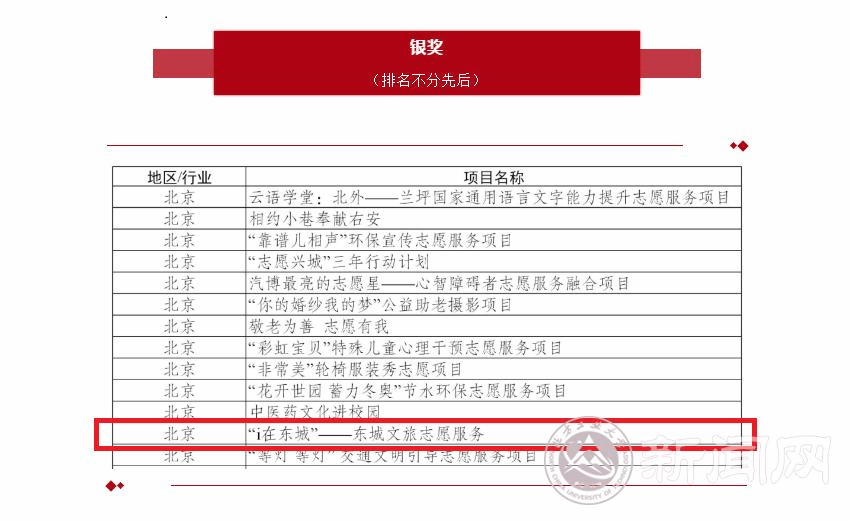 近日,由共青團(tuán)中央、中央文明辦、民政部、水利部、文化和旅游部、國家衛(wèi)生健康委員會、中國殘疾人聯(lián)合會共同舉辦的第五屆中國青年志愿服務(wù)項目大賽暨2020年志愿服務(wù)交流會在廣東東莞圓滿落下帷幕,全國31個省、自治區(qū)、直轄市和新疆生產(chǎn)建設(shè)兵團(tuán)、中直機關(guān)、鐵道等單位的優(yōu)質(zhì)志愿服務(wù)項目參加了評選。我校信息學(xué)院開展的“i在東城”文旅志愿服務(wù)項目榮獲全國銀獎,這是我校首次入圍該項賽事,并取得佳績。