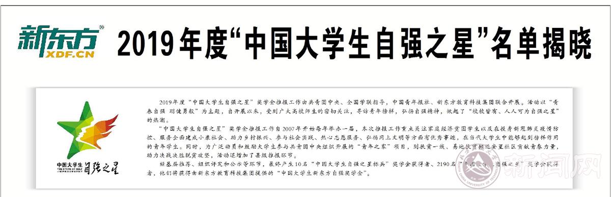 2019年度“中國大學生自強之星”獎學金推報工作由共青團中央、全國學聯指導,中國青年報社、新東方教育科技集團聯合開展。活動以“青春自強 剛健勇毅”為主題,自開展以來,受到廣大高校師生的密切關注,尋訪青年榜樣,弘揚自強精神,掀起了“校校皆有、人人可為自強之星”的熱潮。