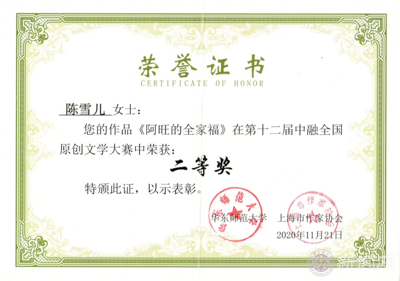 中融全國原創文學大賽是全國性的原創文學賽事,本次比賽設置一等獎1名、二等獎2名、三等獎3名,共收到來自26個省市的文學作品兩千余篇。陳雪兒在董樹寶教授的悉心指導下確定選題,反復打磨參賽作品,數易其稿,經過激烈角逐和三輪嚴格審核,最終獲得二等獎。