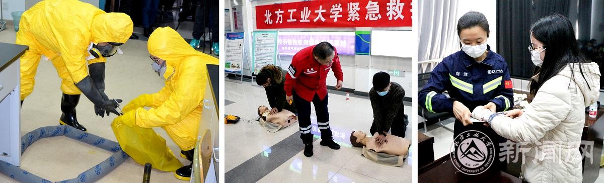 為進一步提高實驗室危險化學品事故應急處置和救援能力,2020年12月25日上午,我校開展了實驗室危險化學品事故應急演練,黨委常委、副校長柳長安出席應急演練,北京市公安局石景山消防支隊危化品防護科專家、中國紅十字會專家到場指導,科技處、教務處、安全穩定工作處、校醫院、信息學院、機械與材料工程學院和土木工程學院的師生60余人共同參加了演練。