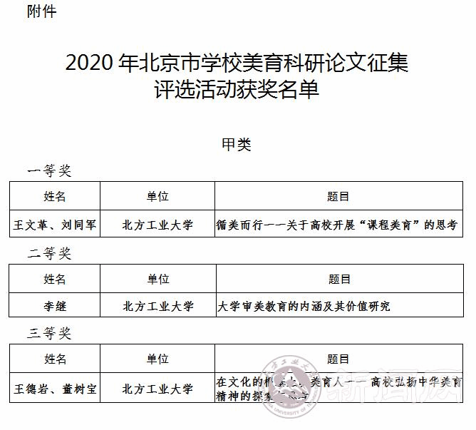 日前,北京市教育委員會舉辦的2020年北京市學校美育科研論文征集評選活動結果公布,我校文法學院“大學美育”教學團隊獲得佳績,報送的3篇論文全部獲獎。