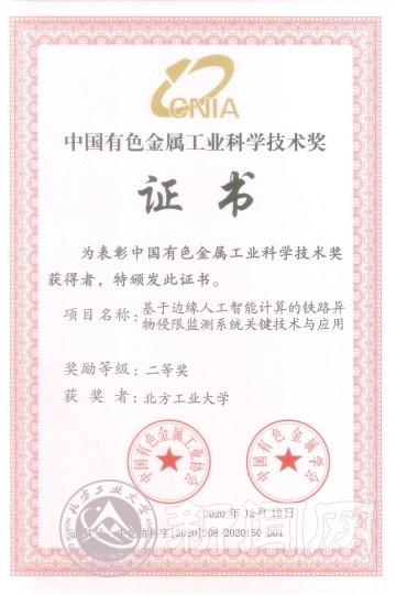 近日,中國有色金屬工業協會、中國有色金屬學會公布了2020年度中國有色金屬工業科學技術獎授獎項目,我校作為第一完成單位申報的“基于邊緣人工智能計算的鐵路異物侵限監測系統關鍵技術與應用”項目獲得二等獎。