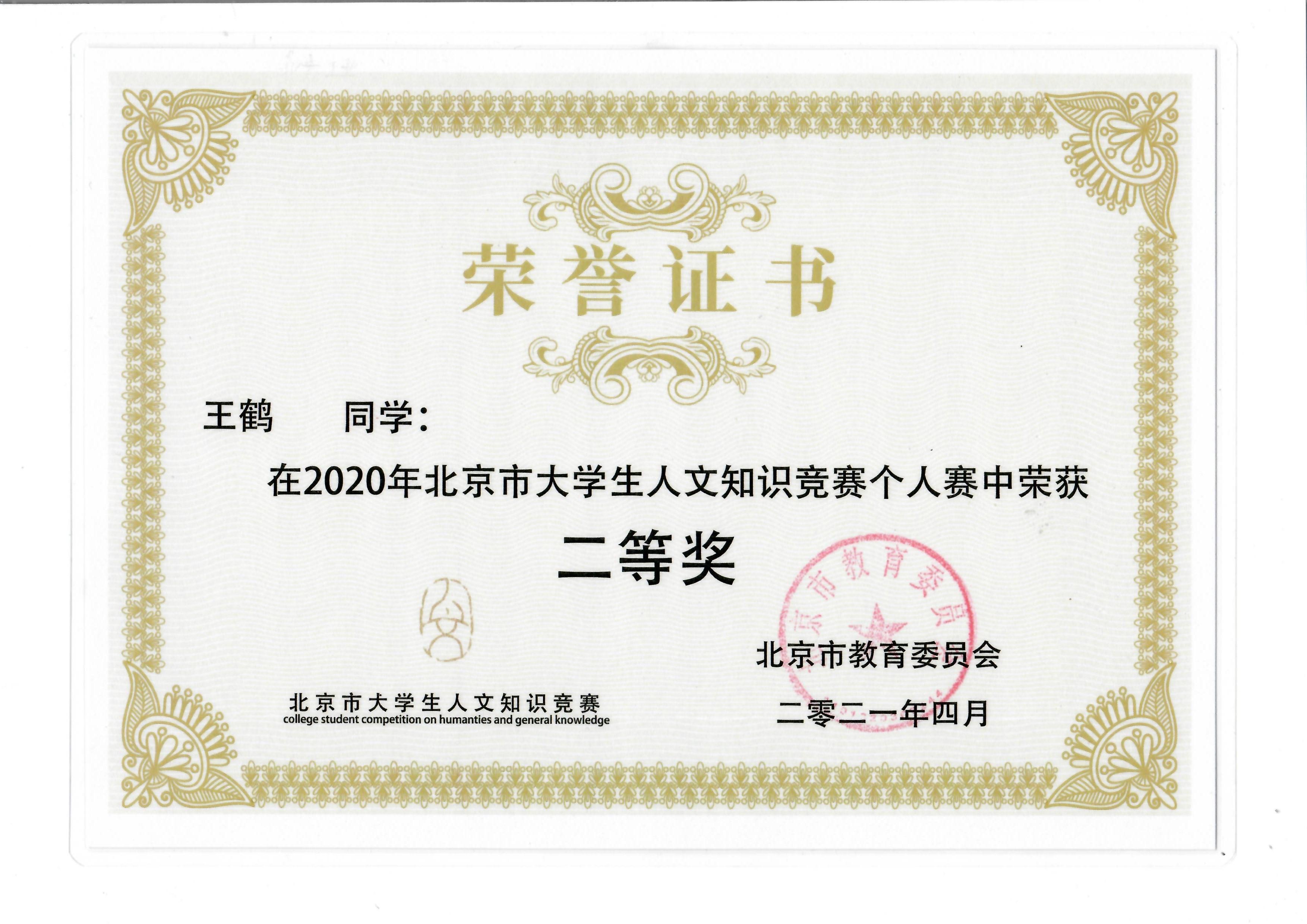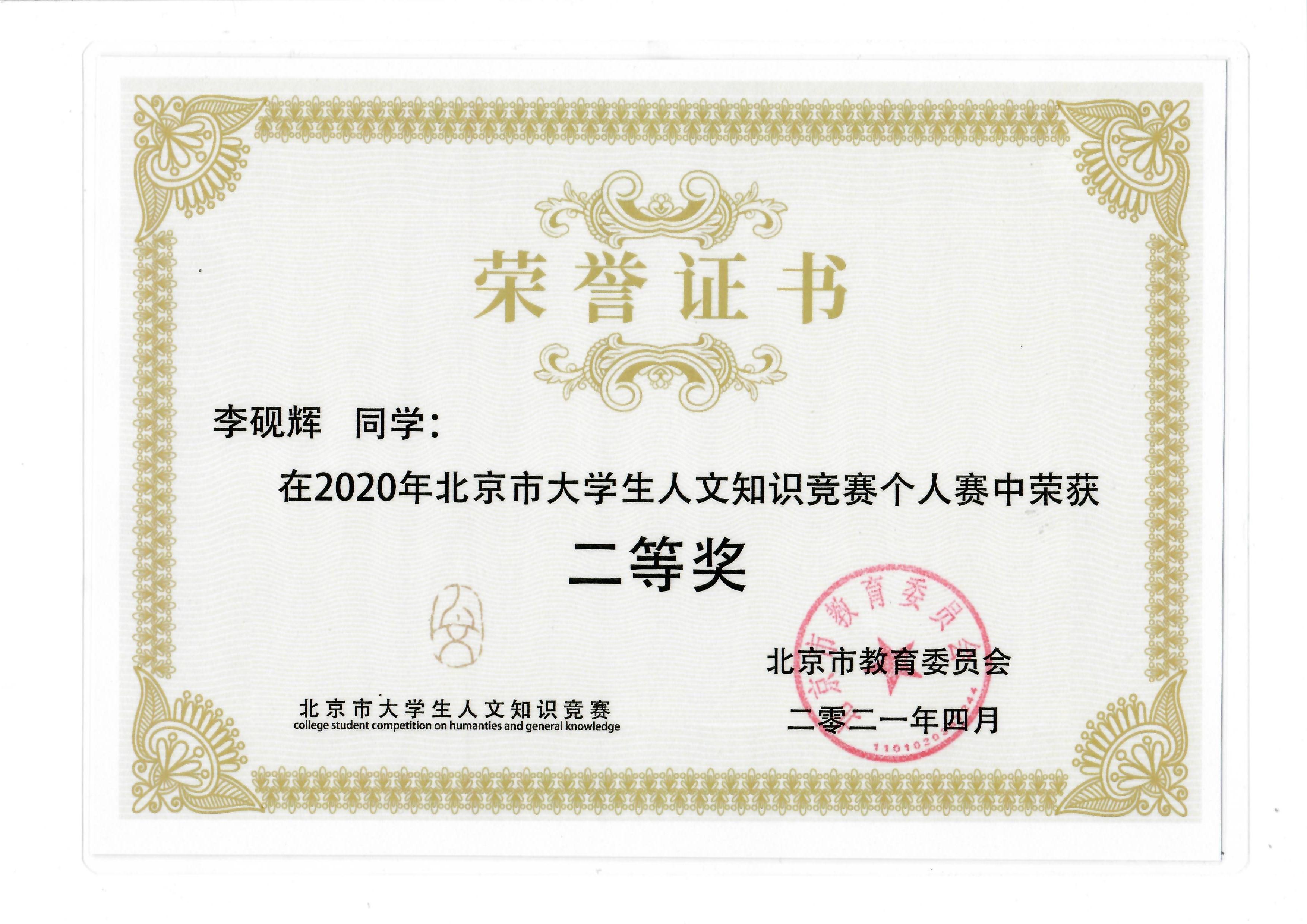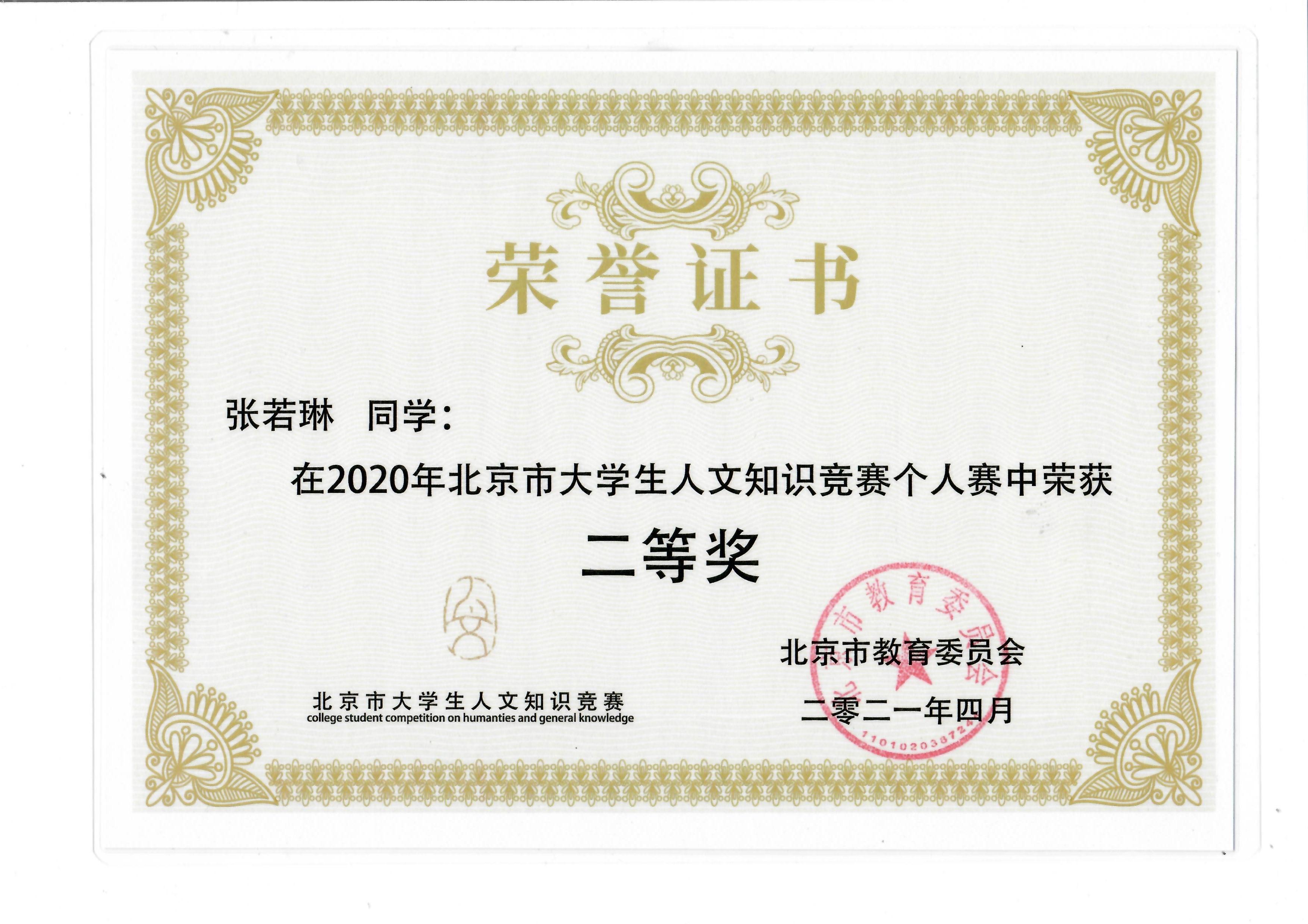 近日,我校學生參加北京市大學生人文知識競賽再傳捷報。文法學院中文18-2班張若琳、中文18-1班李硯輝和中文17-1班王鶴等三名同學均獲得2020年北京市大學生人文知識競賽個人賽二等獎。這一成績是自2018年大賽增設個人賽以來,我校獲獎同學最多的一次。