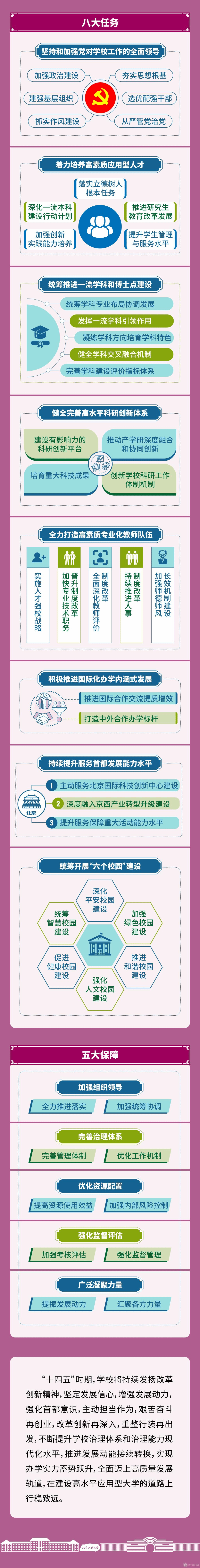 面向“十四五”,學校堅持全面從嚴治黨,落實立德樹人根本任務,以推動高質量發展為主題,以改革創新為根本動力,按照《規劃》明確提出的“三步走”戰略目標、以“八個堅持”為核心發展思路,重點實施“四項計劃”,即人才培養固本強基計劃、標志性成果培育計劃、優秀人才引育計劃、體制機制改革計劃,集中力量建設好高水平應用型大學,促進學校治理體系和治理能力現代化,為服務國家戰略需求和首都“四個中心”功能建設,特別是國際科技創新中心建設提供人才保障和智力支撐。