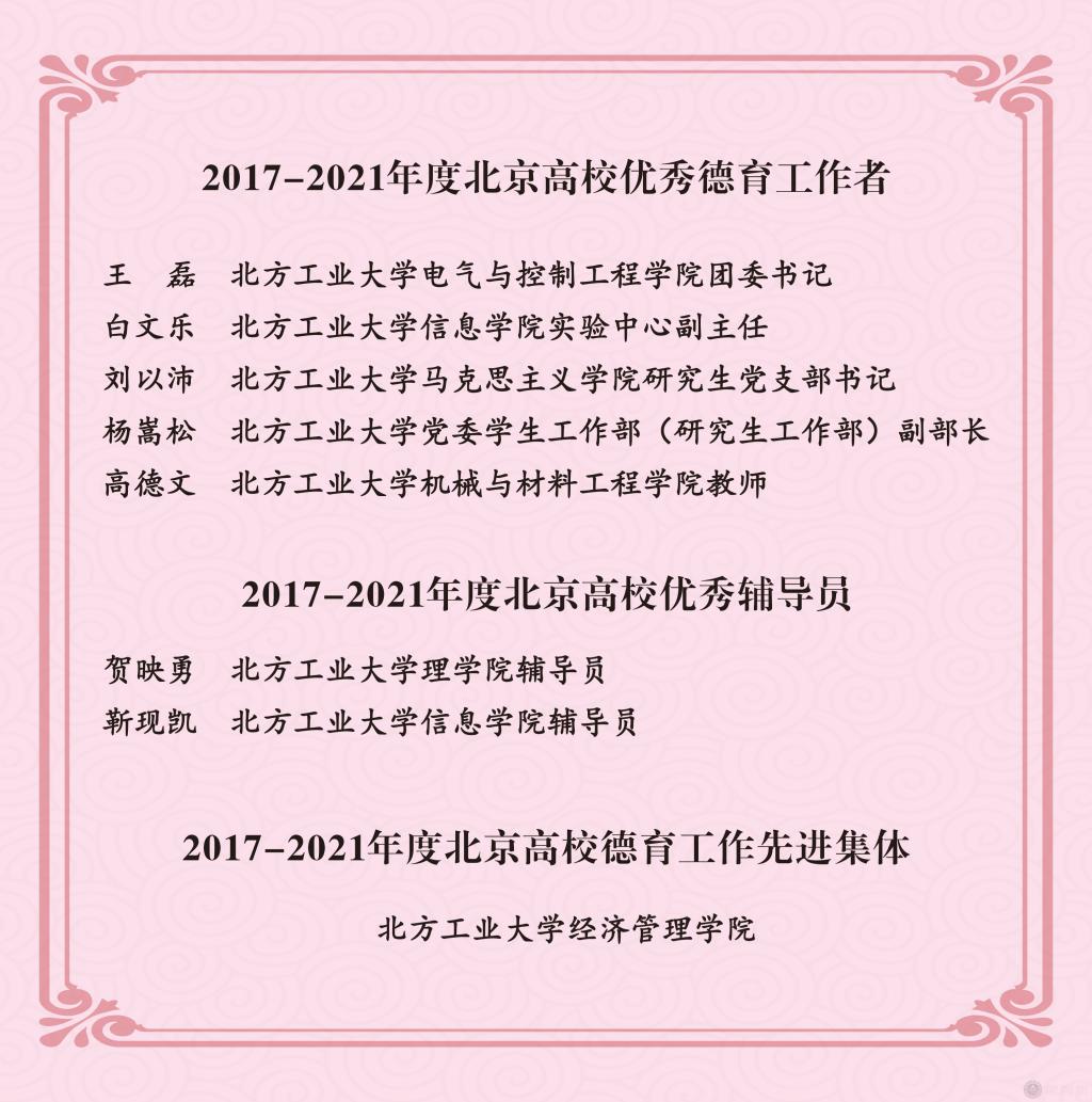電控學院王磊、信息學院白文樂、馬克思主義學院劉以沛、學生工作部楊嵩松、機材學院高德文等5名教師被授予“北京高校優(yōu)秀德育工作者”稱號; 理學院賀映勇、信息學院靳現(xiàn)凱等2名教師被授予“北京高校優(yōu)秀輔導員”稱號,靳現(xiàn)凱同時獲得“北京高校十佳輔導員”提名獎; 經(jīng)濟管理學院被授予“北京高校德育工作先進集體”稱號。