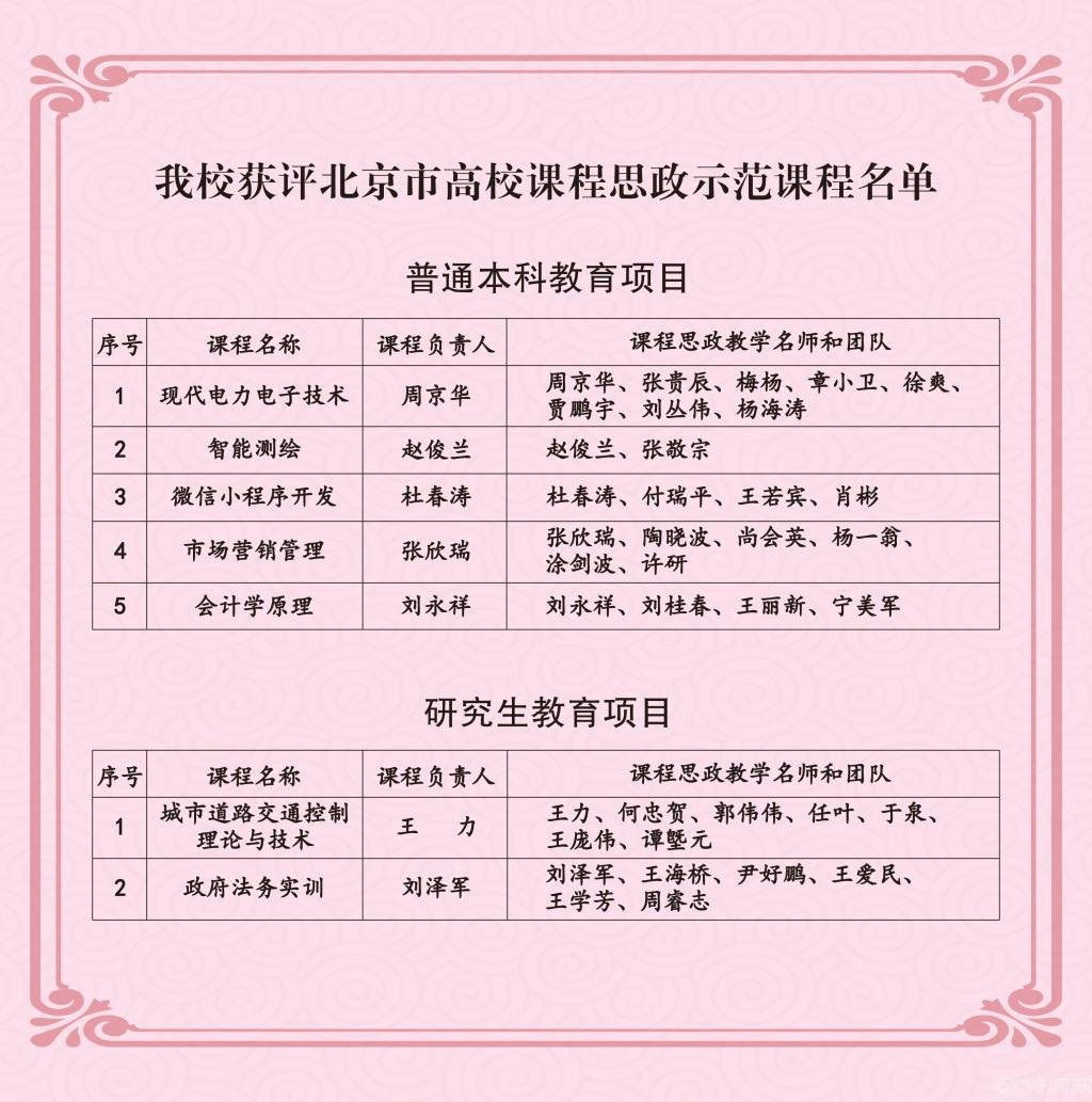 近日,從中共北京市委教育工作委員會、北京市教育委員會發布的《關于公布課程思政示范項目名單的通知》獲悉,我校7門課程入選北京市課程思政示范項目,其中普通本科教育課程5門,研究生課程2門,其授課教師和教學團隊認定為北京市課程思政教學名師和教學團隊,學校課程思政建設迎來“開門紅”。
