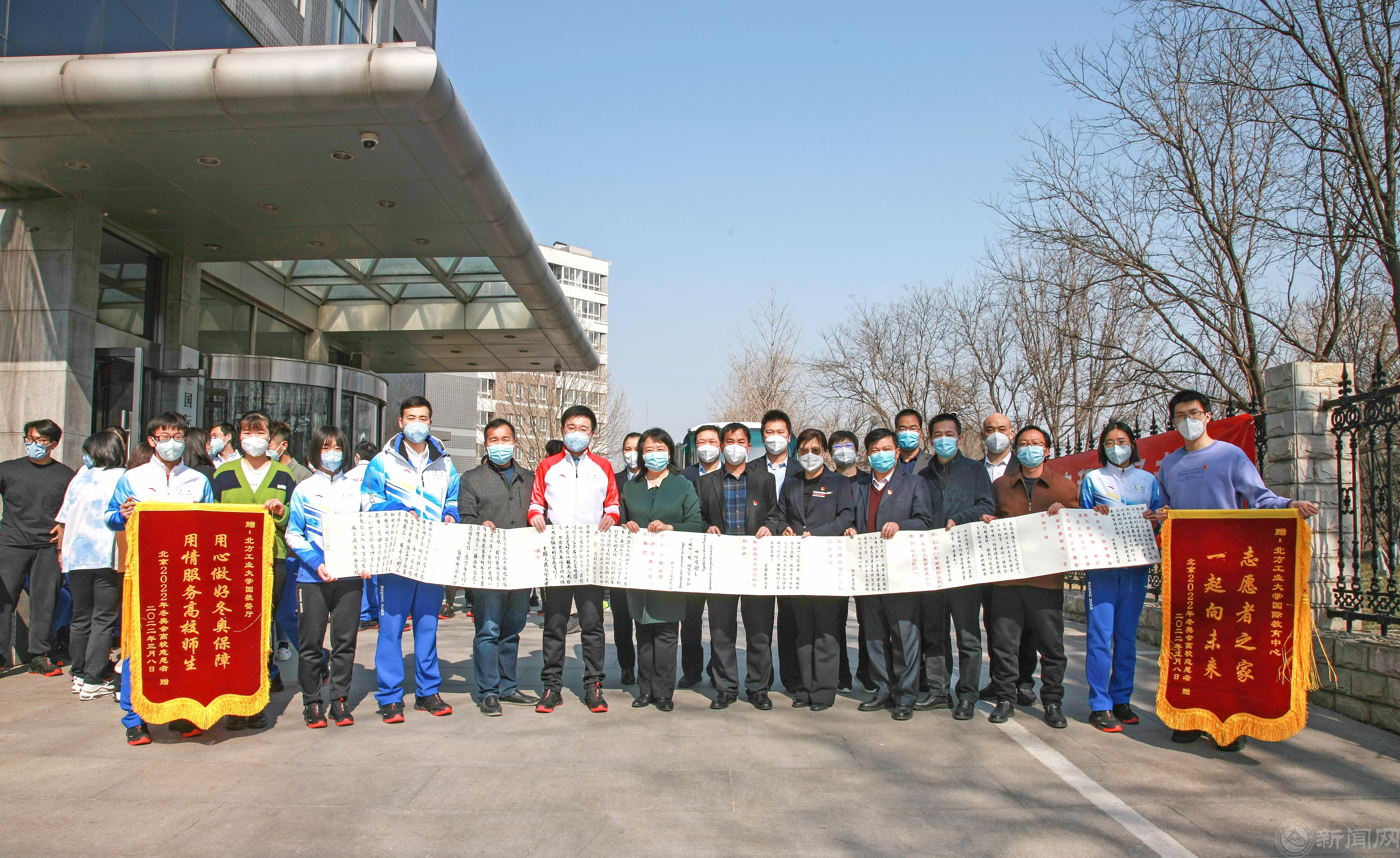 離開駐地的志愿者對學校國教中心戀戀不舍,紛紛與服務保障團隊成員依依惜別,在“身披奧運榮光,開啟美好未來”的標語前合影留念。服務保障團隊送志愿者同學和老師有序登車,一一揮手告別。
