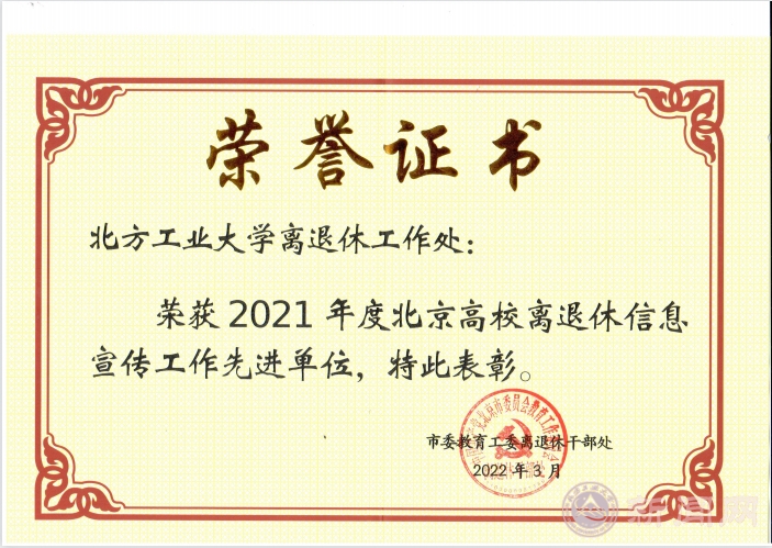 在日前召開的2021年北京高校離退休工作部門負責人會議(線上)上,我校離退休工作處被評為“2021年度北京高校離退休干部信息宣傳工作先進單位”。