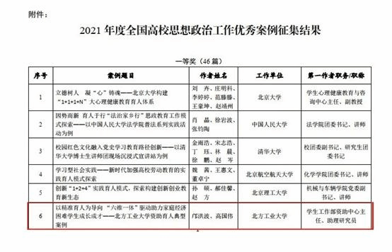 近日,2021年度全國高校思想政治工作優秀案例征集結果發布,我?!兑跃珳视藶閷?“六維一體”驅動助力家庭經濟困難學生成長成才——北方工業大學資助育人典型案例》喜獲一等獎。