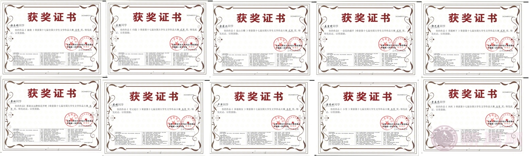 近日,第十七屆全國大學(xué)生文學(xué)作品大賽成績揭曉,我校文法學(xué)院、經(jīng)管學(xué)院十位參賽同學(xué)喜獲佳績,其中一等獎1項,二等獎4項,三等獎5項。