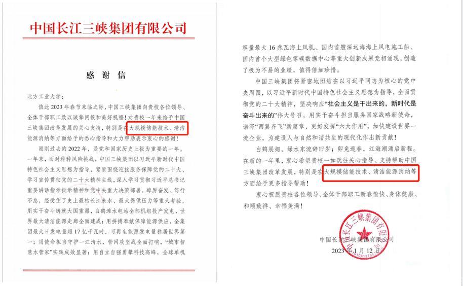 1月12日,我校收到中國長江三峽集團有限公司發來的感謝信。信中表示,在過去的一年里,我校對中國長江三峽集團的改革發展給予了關心和支持,特別是在大規模儲能技術、清潔能源消納等方面給予了悉心指導和大力幫助,對此表示衷心感謝。中國長江三峽集團愿與學校在新的一年里進一步加強交流合作,希望我校在大規模儲能技術、清潔能源消納等領域給予更多幫助和支持,共同為建設人與自然和諧共生的現代化做出新的貢獻。