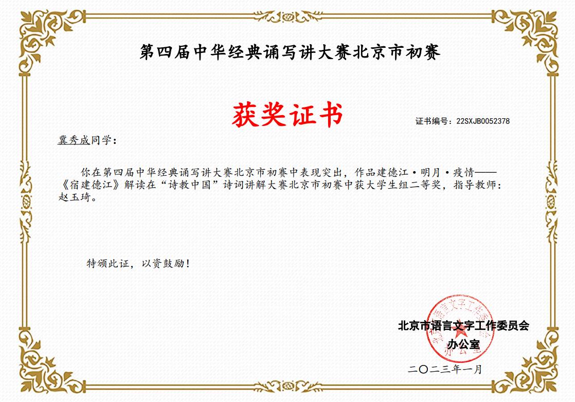 近日,北京市教委、市語委發布《關于公布2022年北京市中華經典誦讀工程系列活動暨第四屆中華經典誦寫講活動初賽獲獎名單的通知》,我校在比賽中獲得二等獎1項,優秀獎3項,優秀組織獎2項,獲獎成績取得新突破。