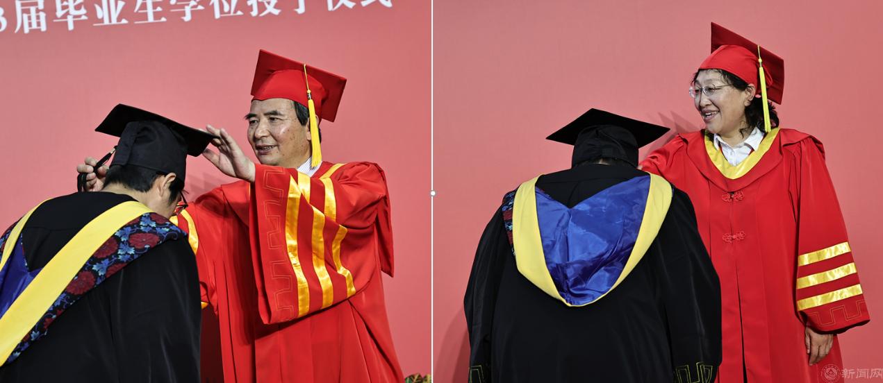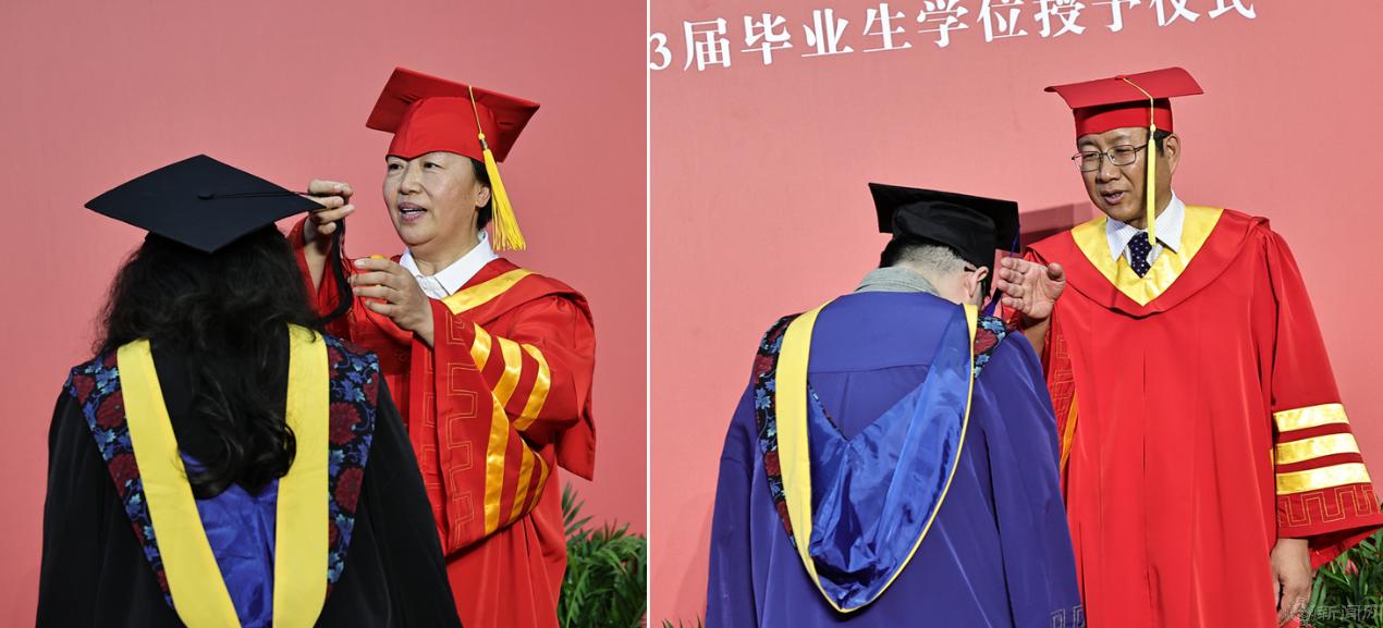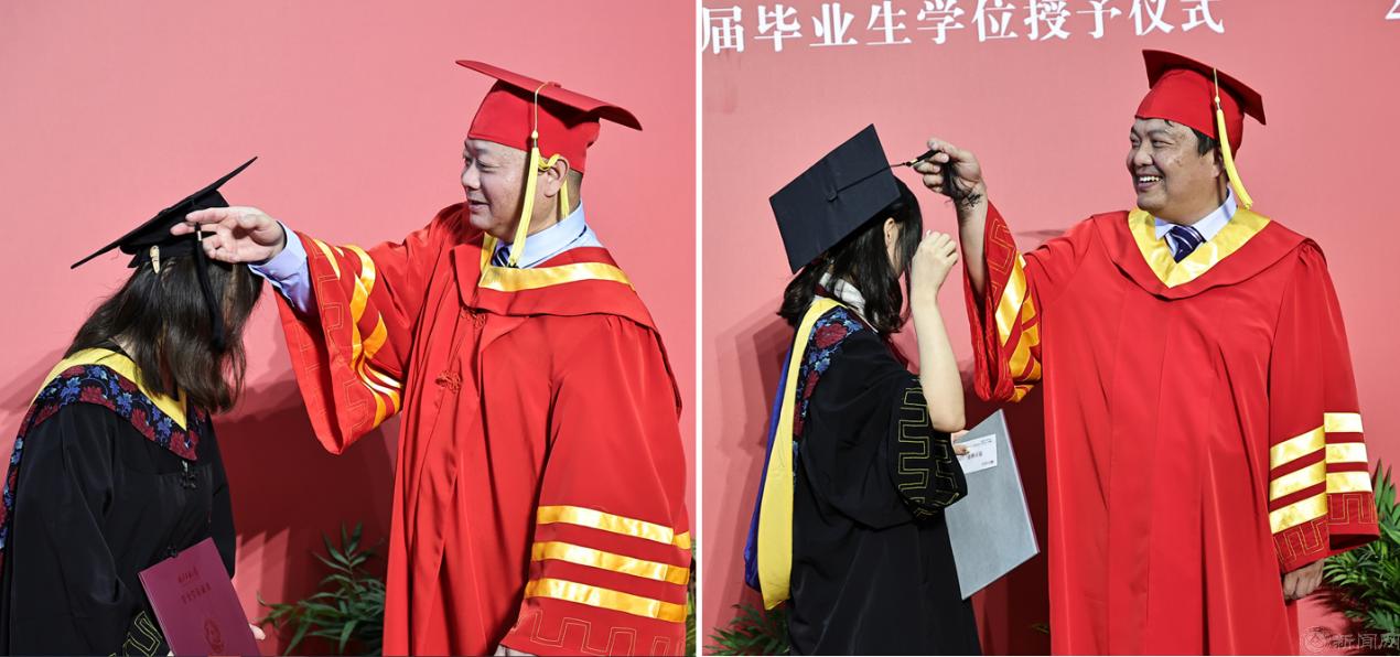 隨后,學位授予儀式在體育館二層進行,校領導、學院領導及學位委員會委員為畢業生們一一撥正流蘇。