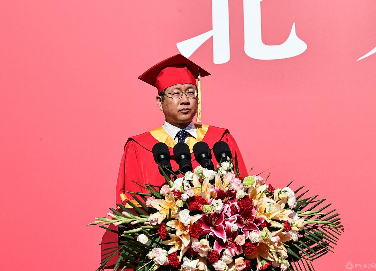 黨委副書記、校長張立峰致辭。他祝賀同學們順利完成學業,開啟人生嶄新篇章,并為2023屆畢業生做最后一次“點名”。他點名典禮當天過生日的同學,祝他們生日快樂;點名疫情防控中不畏艱險勇于奉獻的“抗疫先鋒”,為他們喝彩;點名在學習、運動、科研各個領域不懈探索勇攀高峰的優秀學子,送出校長的“崇拜”;點名服務冬奧、支教鄉村、扎根邊疆的同學,向他們致以敬意;點名友通四海、架設國際溝通橋梁的留學生,向他們致以問候……他誠摯地為同學們點贊、加油,希望同學們繼續興趣盎然的與世界交手,一直走在開滿鮮花的路上!