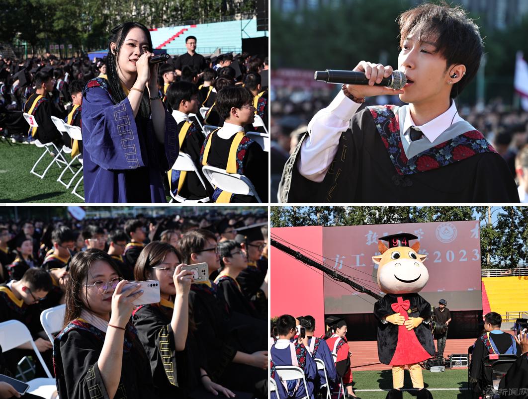 清晨的陽光漸次灑滿綠蔭場,同學們一早就來到典禮現場。“毓秀芳華,終不悔青春夢想;志達四方,心常系家國天下”“青春逢盛世,揚帆正當時”......操場上的一幅幅畢業寄語,動情地表達著工大學子們即將別離母校、展翅高翔的激動心情。幾位畢業生歌手從人群中走出,激情獻唱《起風了》《那些年》《海闊天空》《鳳凰花開的路口》《祝你一路順風》《我要飛得更高》,唱出了感恩工大、青春報國的赤子之心。畢業視頻“毓秀青春紀念冊”生動回顧了同學們校園生活的點點滴滴,勾起了同學們在北方工大美好的青春記憶。