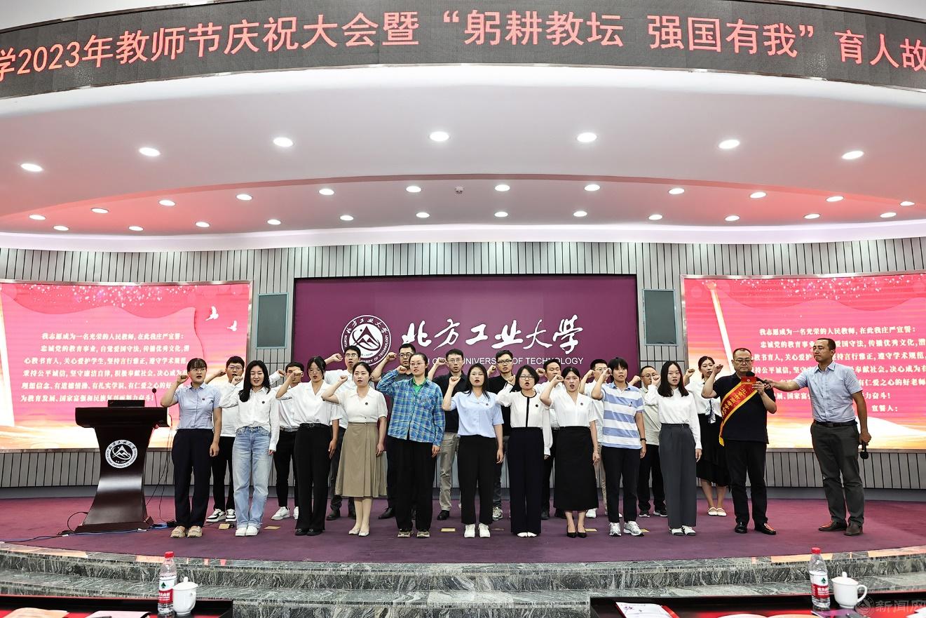 2023年新入職的31名教師在北京市教學(xué)名師周京華的帶領(lǐng)下進(jìn)行宣誓,鄭重許下忠誠于黨的教育事業(yè)、落實(shí)立德樹人根本任務(wù)的錚錚誓言。