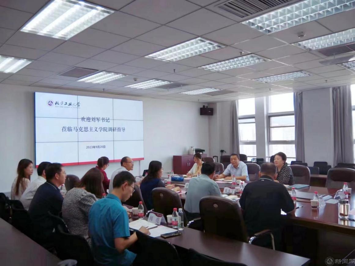 劉軍指出,馬克思主義學院要對標看齊加強新時代馬克思主義學院建設意見、教育部高校思政課建設新標準的相關要求,在北京市重點建設馬克思主義學院這一新賽道上,堅持守正創新,勇擔時代使命,為高水平應用型大學建設提供內生動力和文化支撐。一是要扛起“立德樹人”使命。準確把握新時代“立德樹人”本質內涵,切實發揮思政課的價值引領作用,推動習近平新時代中國特色社會主義思想在青年學生中入腦入心入行。二是要完善“大思政”格局。把握“大思政”建設規律,建立思政課教師與輔導員、專業教師的合力育人機制,推動思政課程和課程思政耦合聯動,深化大中小學思政課一體化建設,實現全員、全程、全方位育人。三是配齊建強思政課教師隊伍。堅持師德為先,強化師德師風建設,完善思政課教師培養、考核、評價體系,在工作格局、支持保障等方面采取有效措施,不斷提高思政課教師的能力水平,發揮教師的積極性、主動性、創造性,培養一批“培根鑄魂、啟智潤心”的大先生。四是要進一步凝練學科特色。結合學校辦學傳統、科研優勢和學院教師研究專長,面向國家重大需求和區域社會發展要求,堅持特色發展,聚焦研究領域。五是要進一步深化社會服務。與石景山區、門頭溝區深度合作,發揮好京西地區智庫作用,以服務求支持,以貢獻求發展;建設好“當代馬克思主義與工業文明研究中心”,傳承“工業報國”“工業興國”“工業強國”的工大思政特色。