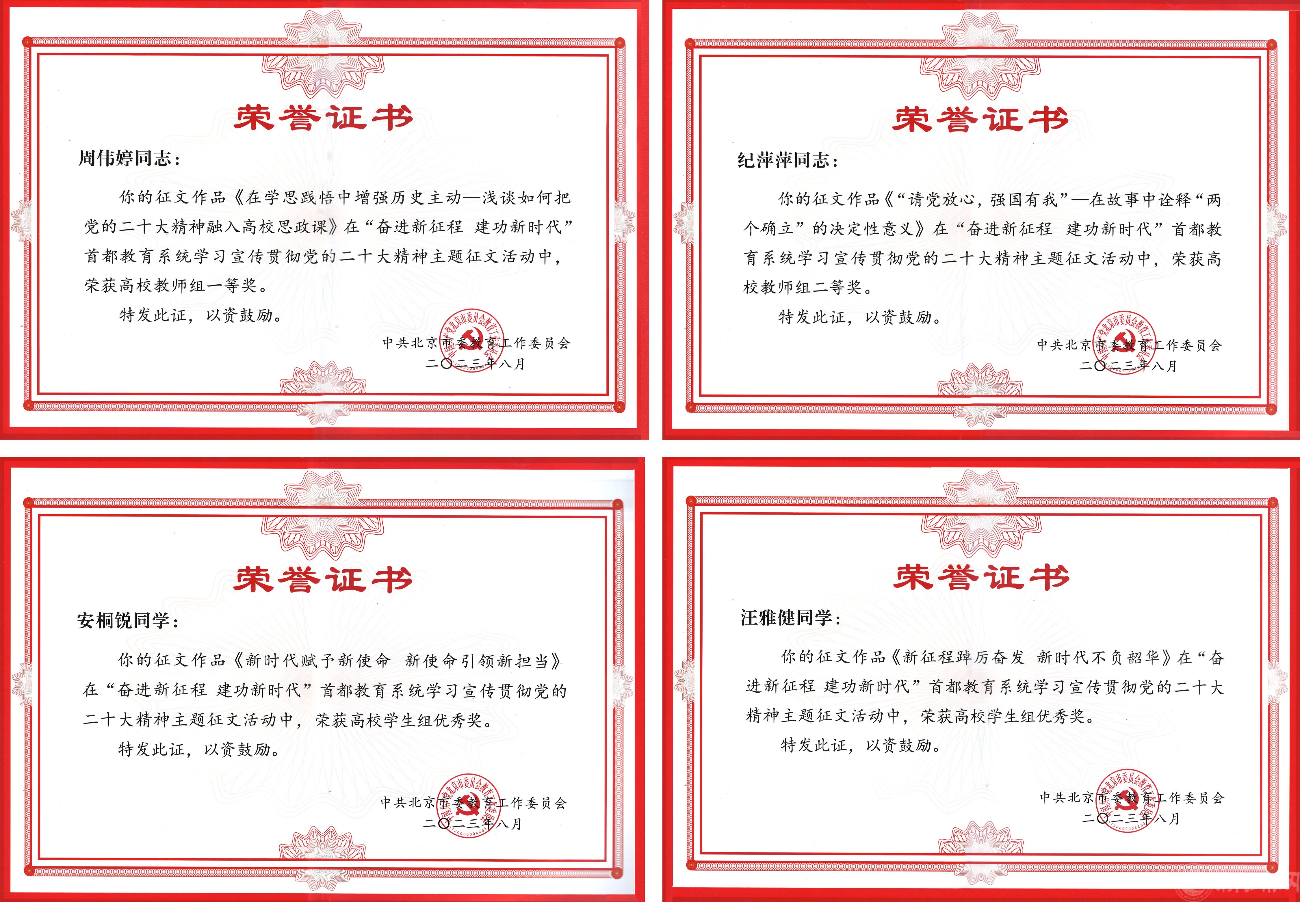 近日,由北京市委教育工委、北京市教育委員組織開(kāi)展的“奮進(jìn)新征程 建功新時(shí)代”主題征文活動(dòng)獲獎(jiǎng)名單公布。我校馬克思主義周偉婷、紀(jì)萍萍分獲高校教師組一、二等獎(jiǎng),文法學(xué)院安桐銳、倫敦布魯內(nèi)爾學(xué)院汪雅健獲高校學(xué)生組優(yōu)秀獎(jiǎng)。